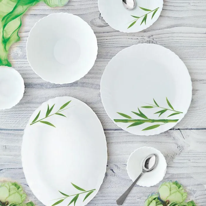 | Tuff German glass technology which is break & chip resistant | Extra strong, thermal resistance and scratch resistant | Light weight and easy to clean | Smooth surface, dishwasher safe, stackable, microwave safe | Food grade – 100 percent hygienic100 percent vegetarian - bone ash free and recyclable | Package Contents: 6-Pieces Full Plate, 6-Pieces Quarter Plate, 6-Pieces Veg Bowl , 2-Pieces Medium Serving Bowl Liters), 1-Piece Oval Platter and 6-Pieces Soup Bowl superior quality products with European Standards reaches your household