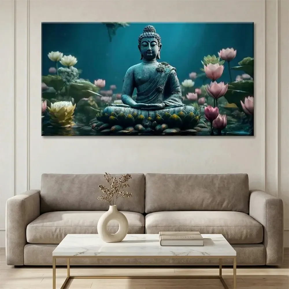 Transform your living space into a sanctuary of profound serenity with our Buddha’s Tranquil Meditation Amidst Blue and Pink Lotus canvas print. This artistic masterpiece captures the essence of inner peace, depicting the Buddha seated gracefully within a mystical pond adorned with ethereal blue and pink lotus flowers. The high-definition printing technology ensures that every hue is rendered with stunning clarity and depth, creating a captivating focal point for any modern or traditional home interior. Crafted with meticulous attention to detail, each artwork is stretched over a premium wooden frame, ensuring both durability and a sophisticated aesthetic appeal. Designed for effortless installation, our canvases arrive ready to hang, complete with mounted hooks and a precise nail guide for perfect placement. Whether you are seeking to enhance the meditative ambiance of your bedroom or looking to infuse your living room with a calming, spiritual energy, this piece offers the perfect balance of luxury and tranquility. Every element of this wall hanging, from the quality of the canvas to the sturdiness of the frame, reflects WallMantra’s dedication to excellence, making it a timeless addition to your curated home collection.