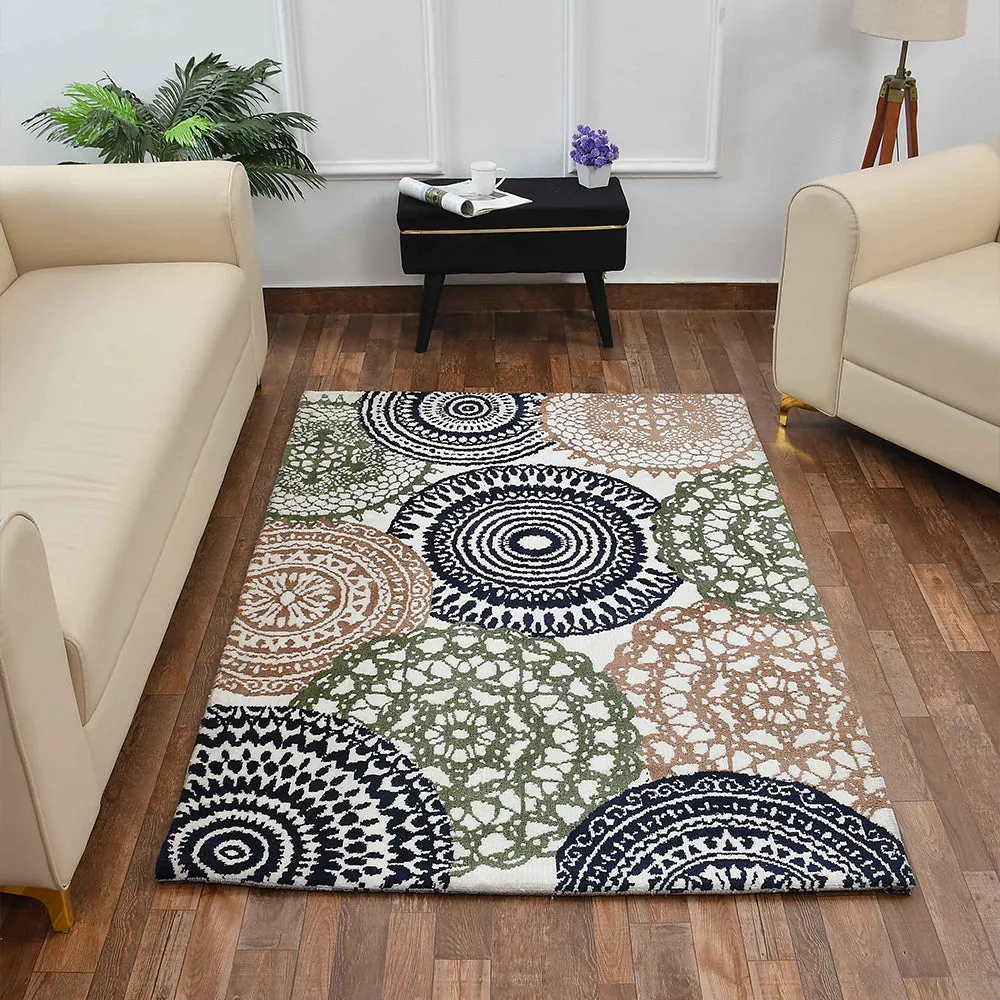 Designer Green & White Geometric Print Polyester Carpet for Living Room
