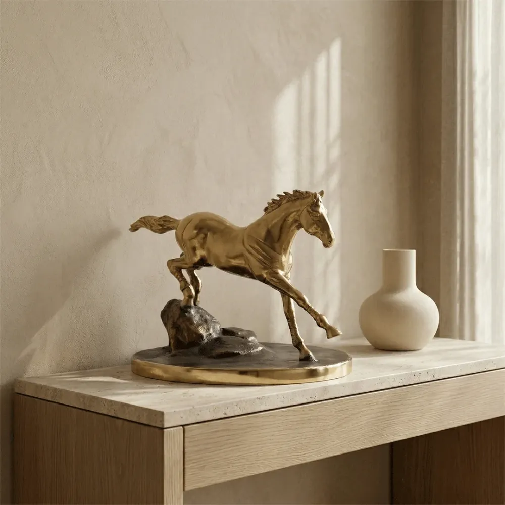 Celebrate movement, strength, and timeless artistry with this exquisitely crafted solid brass horse sculpture. Capturing the dynamic posture of a galloping horse, the piece embodies energy and ambition, making it a powerful symbol within refined living spaces. The sculpture features a radiant gold-toned finish that enhances its sculptural details, from the flowing mane to the poised stride; while the contrasting textured base adds depth and grounding to the composition. This interplay of form and finish creates a visually captivating centerpiece that effortlessly draws attention. Perfect for console tables, office desks, or curated shelves, it brings a sense of prestige and sophistication to both modern and classic interiors. Crafted from premium solid brass, this piece offers enduring quality and timeless appeal, making it not just décor but a statement of style and aspiration.