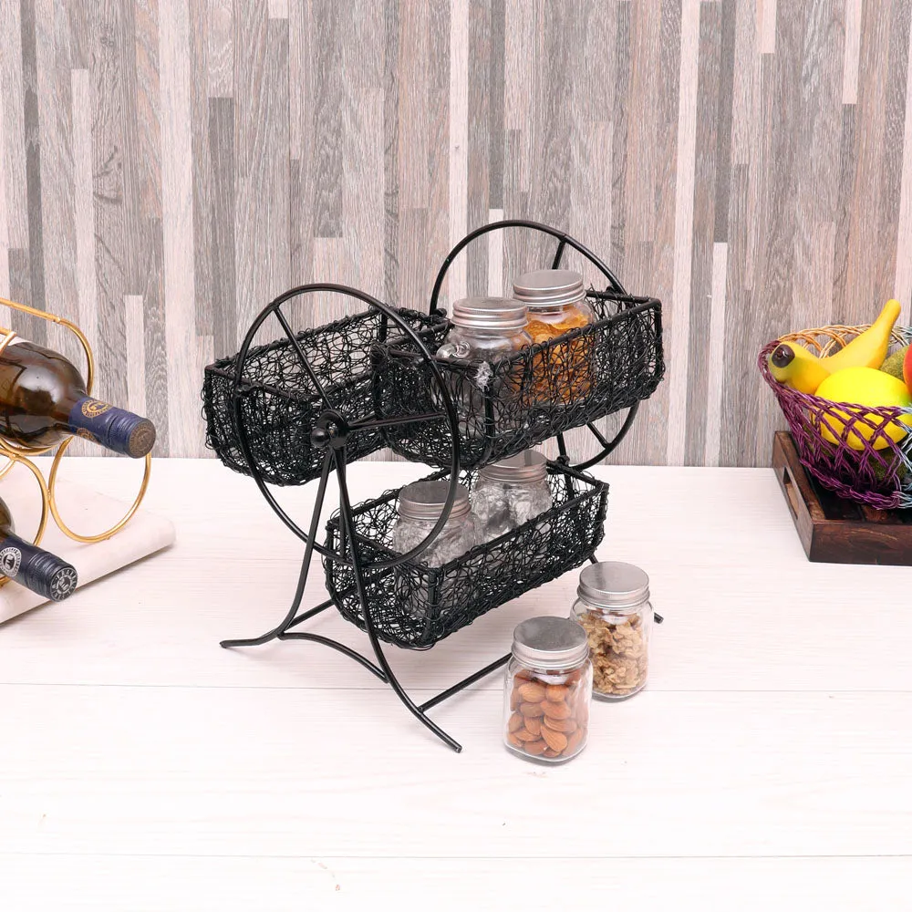 | Dimension (In inches)- L 12 X W 10 X H 8 | Material- Made of resilient metal and glass | Usage- Presenting dry fruits in an elegant way to guests | Tough and resilient metal stand and glass jars | Package Content - 1 Platters, 6 jars