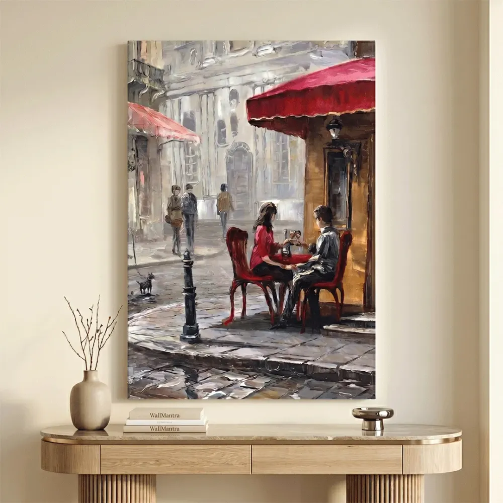 Bring timeless romance and European charm into your space with this beautifully composed Paris café canvas wall art. The artwork captures a serene moment of a couple seated at a cozy street café, surrounded by classic architecture, soft lighting, and subtle urban life in the background. The muted tones of the street blend seamlessly with the striking red accents of the café setting, creating a perfect visual balance between warmth and sophistication. Gentle brush strokes and a slightly impressionistic style add depth and emotion, making the piece feel alive and immersive. Ideal for living rooms, bedrooms, or intimate spaces, this artwork creates a calming yet engaging focal point. Its vertical orientation enhances wall height and fits beautifully above consoles, sideboards, or compact wall areas. Printed on premium-quality canvas, it ensures long-lasting durability and rich color retention, making it a refined addition to both modern and classic interiors.