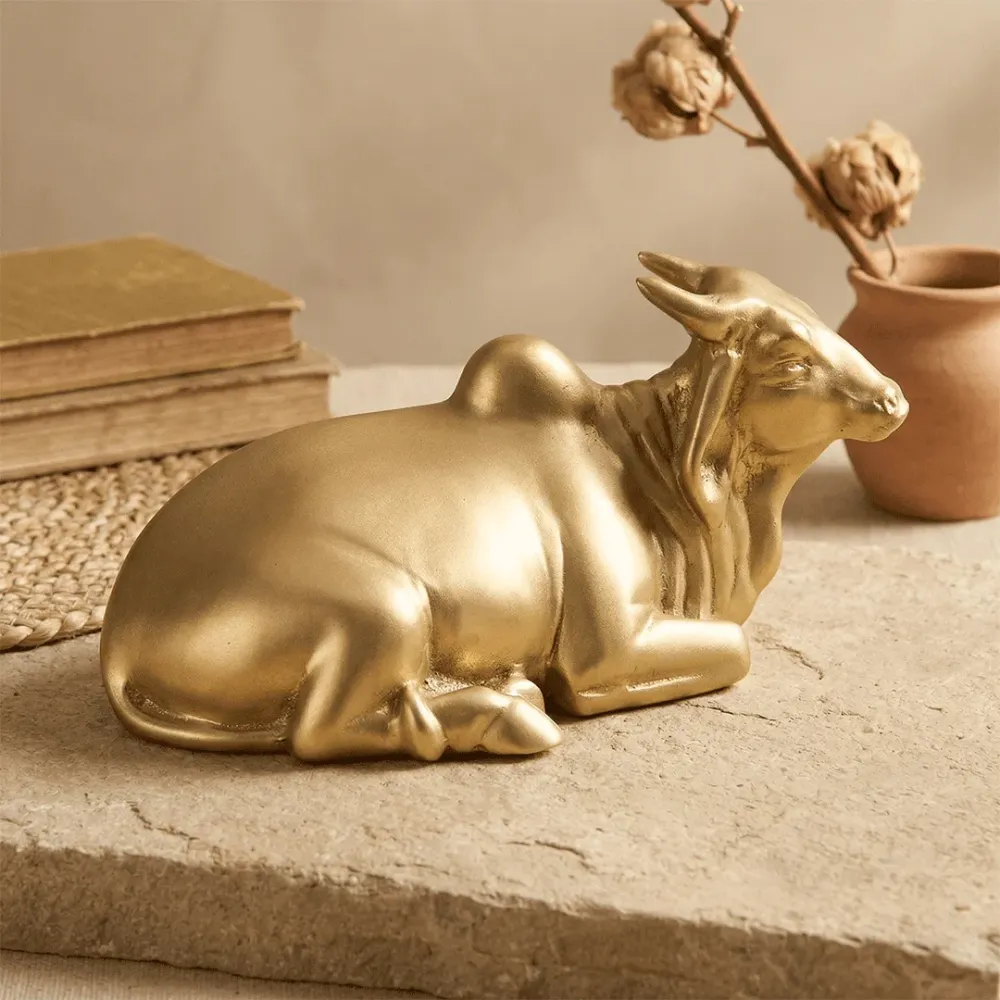 Rooted in cultural symbolism and timeless artistry, this solid brass Nandi bull figurine embodies strength, devotion, and शांत tranquility. Designed with a smooth, sculptural form, the piece captures the calm and grounded presence of Nandi, making it a meaningful addition to both spiritual and contemporary interiors. The refined gold-toned finish enhances its luxurious appeal, while the soft contours and minimal detailing give it a modern, collectible aesthetic. Whether placed on a console, coffee table, or पूजा space, it brings a sense of balance and quiet sophistication to its surroundings. Crafted from premium solid brass, this piece ensures durability while maintaining its rich sheen over time. Ideal for those who appreciate symbolic décor with a modern touch, it seamlessly blends heritage inspiration with elevated design sensibility.