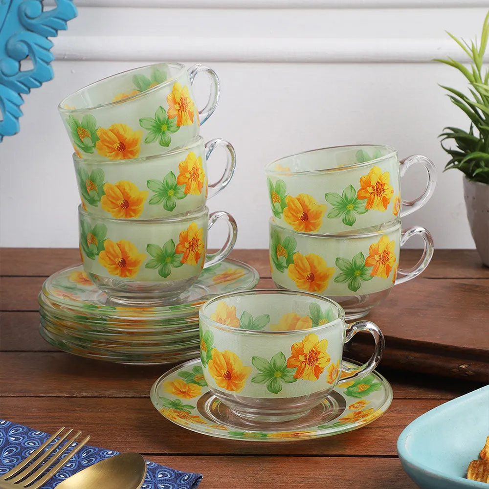 Summer Floral Print Green & Orange Translucent Tea Cups With Saucers Set Of 6