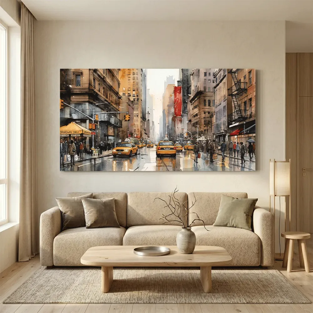 Infuse your space with the energy of a bustling metropolis through this striking panoramic canvas wall art. Showcasing a vivid city street lined with towering architecture, glowing storefronts, and iconic yellow taxis, the artwork captures the rhythm and movement of urban life with artistic finesse. The interplay of warm amber tones and soft neutral shades creates a balanced composition that feels both lively and sophisticated. Subtle reflections on the street and fluid brushwork add depth and realism, making the scene immersive and visually engaging. Designed in a wide panoramic format, this piece is perfect for placement above sofas, beds, or office desks, where it serves as a bold focal point. Crafted on premium canvas with a refined finish, it offers lasting durability while elevating interiors with a contemporary, cosmopolitan charm.